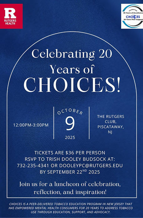 CHOICES is celebrating its 20th Anniversary on October 9, 2025, at The Rutgers Club in Piscataway. Founded by Dr. Jill Williams, CHOICES (Consumers Helping Others Improve their Condition by Ending Smoking) is a peer-led program addressing tobacco dependence among individuals with mental health conditions. The event will bring together leaders from across New Jersey’s mental health and addiction communities to reflect on two decades of impact and innovation. To learn more, click here.