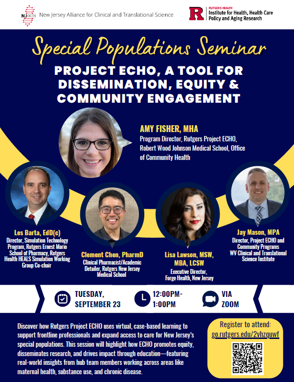 FreeJoin us on Tuesday, September 23, at 12 pm ET for a presentation of the NJ ACTS Special Populations Core 2025 Seminar Series – Project ECHO, a Tool for Dissemination, Equity & Community Engagement with Amy Fisher, MHA Program Director, Project ECHO, RWJMS & a Panel of Experts