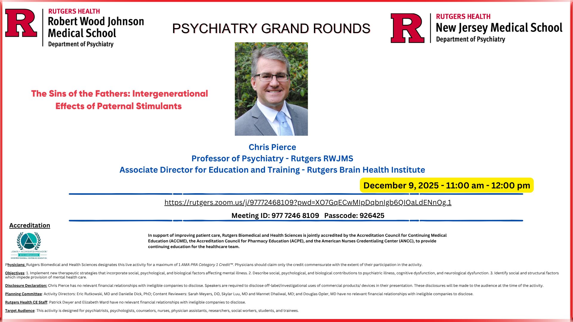 The Rutgers Department of Psychiatry is excited to invite you join to our Grand Rounds on Tuesday, December 9, 2025 @ 11AM.