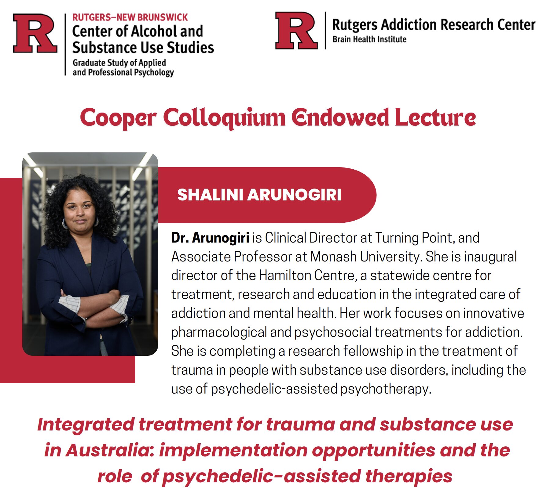 FreeJoin us for the Cooper Colloquium Endowed Lecture on October 17th, hosted by the Center of Alcohol and Substance Use Studies and the Rutgers Addiction Research Center. Dr. Shalini Arunogiri, Clinical Director at Turning Point and Associate Professor at Monash University, will present on “Integrated treatment for trauma and substance use in Australia: implementation opportunities and the role of psychedelic-assisted therapies.”