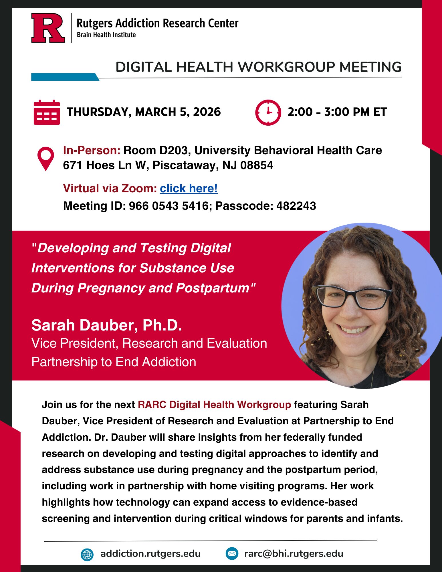 FreeJoin us for the next RARC Digital Health Workgroup featuring Sarah Dauber, Vice President of Research and Evaluation at Partnership to End Addiction. Dr. Dauber will share insights from her federally funded research on developing and testing digital approaches to identify and address substance use during pregnancy and the postpartum period, including work in partnership with home visiting programs. Her work highlights how technology can expand access to evidence-based screening and intervention during critical windows for parents and infants.